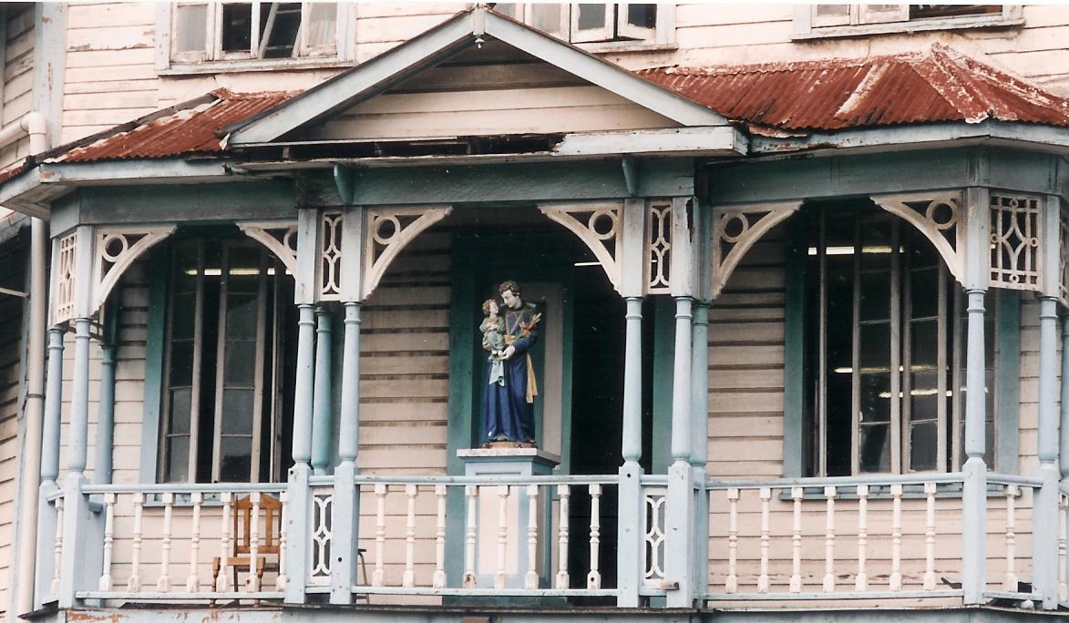 Home on stilts with clapboard, brilliant white paint, fretwork, spindles and louvres